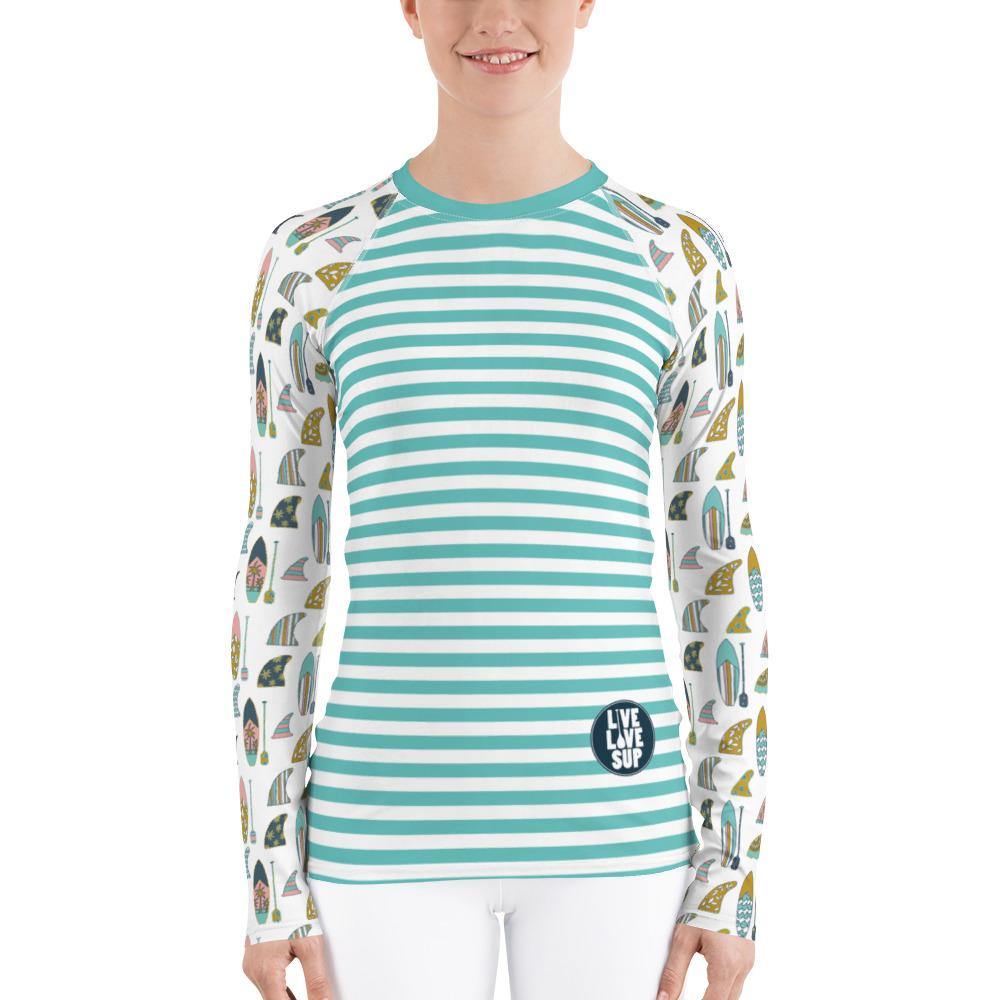 Embrace the water in style with our Women’s Turquoise Striped SUP Rashguard, featuring a charming hand-drawn board and paddle motif. Designed for active water lovers, it offers a fitted yet comfortable silhouette that's perfect for paddling. Crafted with 82 % polyester and 18 % spandex for soft four-way stretch, this long-sleeve rashguard moves with you while providing essential protection. With a UPF rating of 38-40, it shields your skin from the sun’s rays. The longer cut and flat-ergonomic seams promise both coverage and comfort—just size up if between sizes to ensure a great fit.LIVE LOVE SUP+1