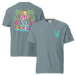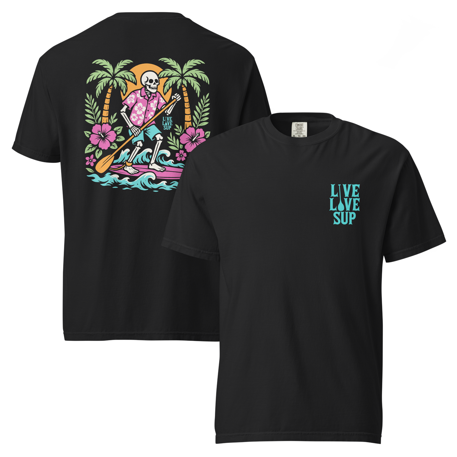 Unisex Surf Skeleton Flowers Premium T-shirt Garment Dyed I Live Love SUP - Black / S is backordered and will ship as soon as it is back in stock.