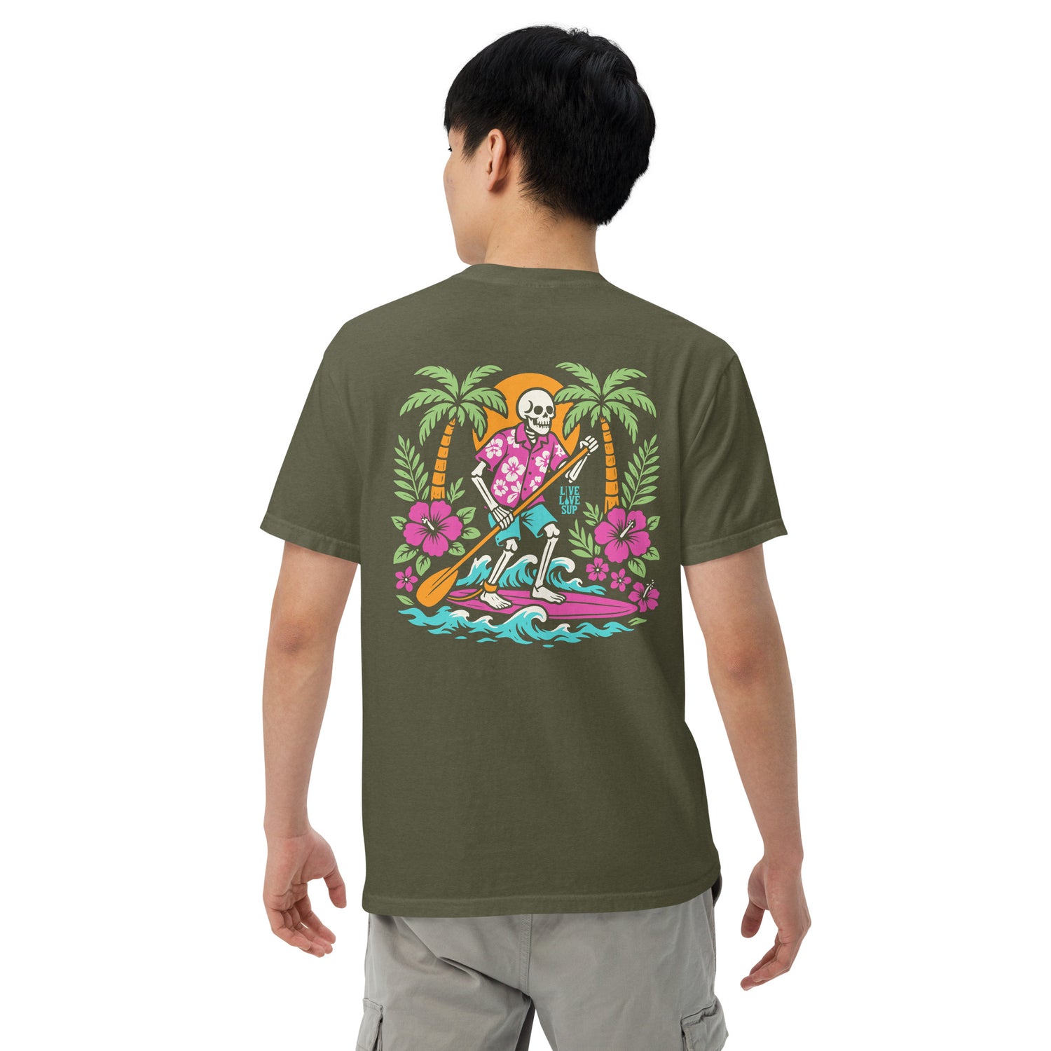 Unisex Surf Skeleton Flowers Premium T-shirt Garment Dyed I Live Love SUP